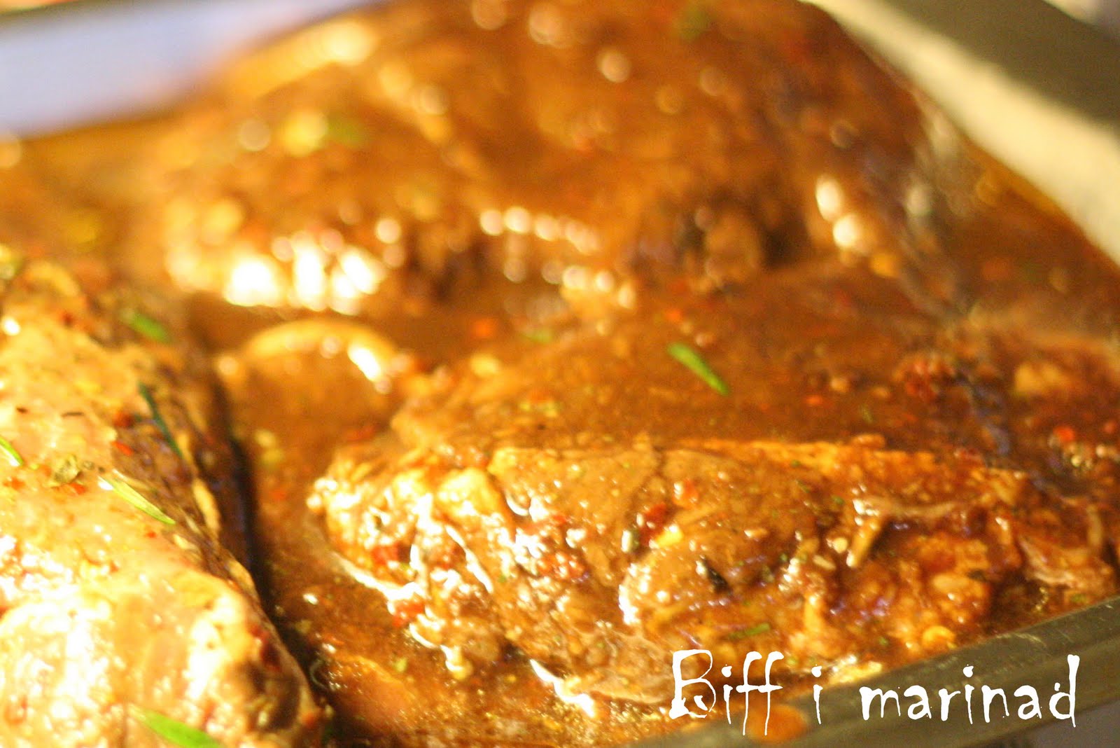 Det finns ju inga dåliga väder sägs det ju…Bara dåliga kläder och det där försommarvädret lyser ännu med sin frånvaro.Det kan faktiskt vara lite mysigt med regn också. Vi grillade biffkött som jag lagt i en marinad ett dygn i förväg. Här kommer recept på en god marinad som fungerar både till gris och nötkött.