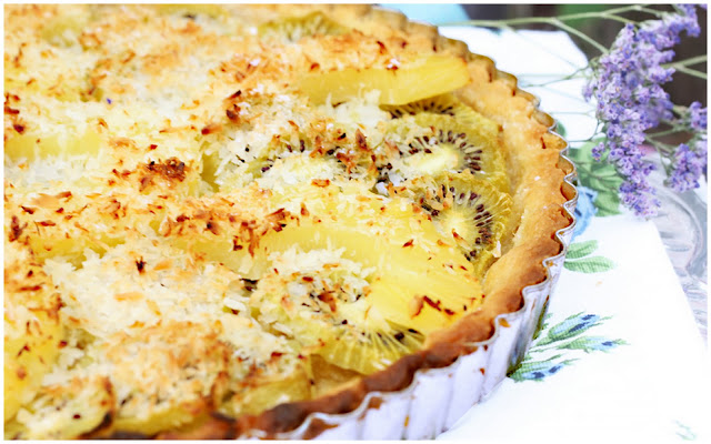 Nästan varje matblogg jag besökt denna vecka gör just nu ananaspaj. Klart man blir sugen när man blir sittande framför mängder av vackra bilder med mumsig ananas.Det är så man ska blogga, få läsarna att dregla och inspirera med det man delar med sig av! Klart jag hakar på trenden men jag gör min egen tolkning av ananaspaj och den är säkert minst lika god som alla andra duktiga matbloggares pajer därute och jag hoppas jag kan få er att dregla lite också ; D En fräsch paj med ananas, kiwi och kokosflingor.