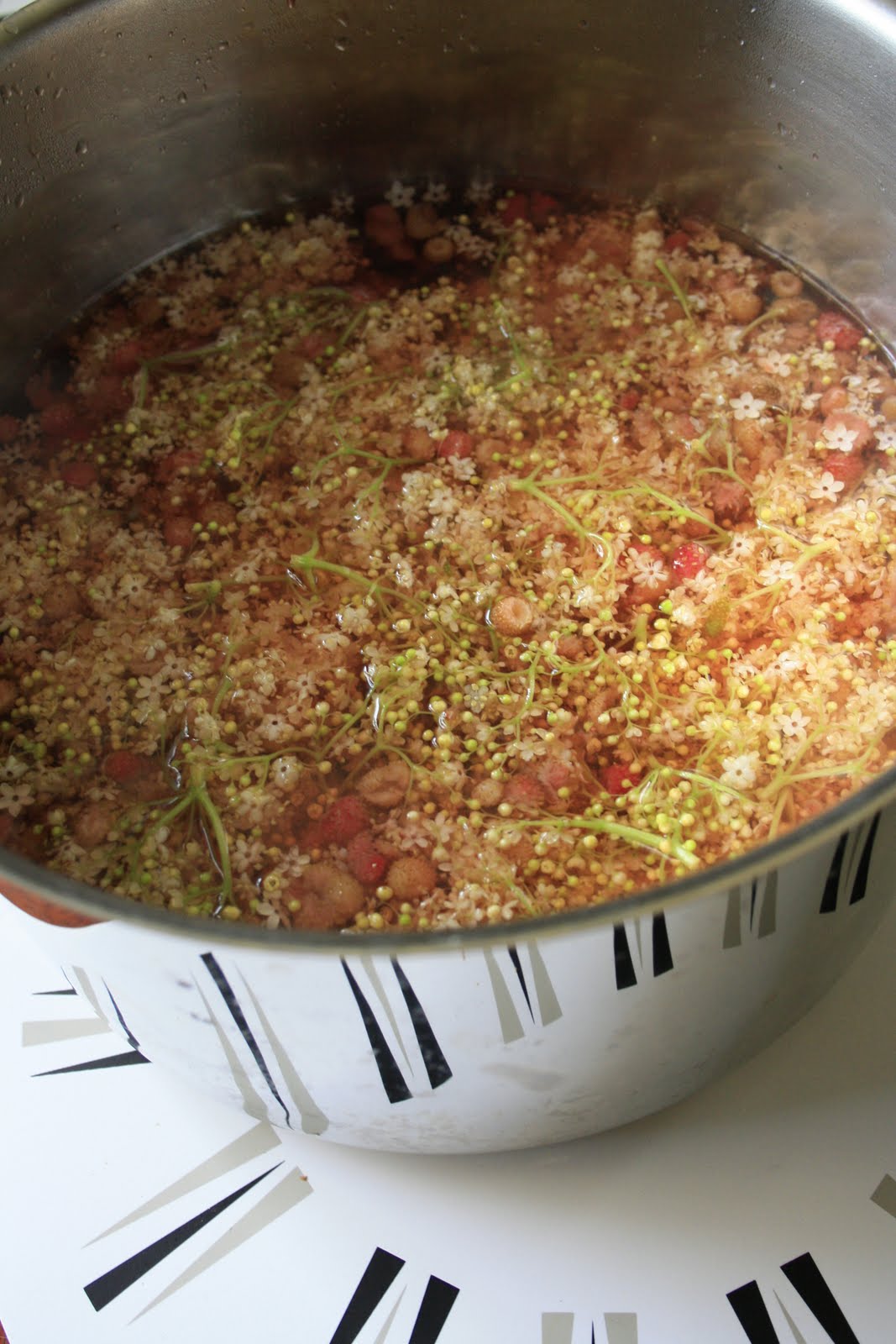 Jag hittade en fläderbuske ca 50 meter från mitt hus bara så där av en slump. Ganska roligt eftersom jag nnågra timmar innan jag hittade busken pratat med mamma i telefonen och beklagat mig över att jag inte hittat någon fläder och att jag inte visste riktigt var jag skulle leta. Helt plötsligt stod busken där framför mig samma dag på ett ställe jag går förbi varje dag.Smultron och fläder fick det bli av saften, då det nu växer massor med smultron. Det kan vara världens godaste bär. Och visst låter det som en underbar kombination!