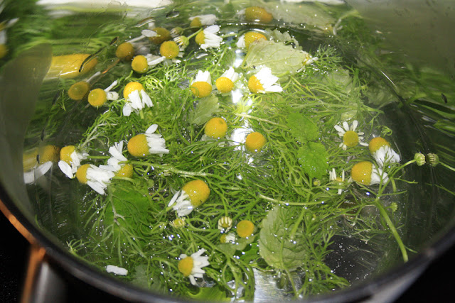 Gör så här: Häll upp en kastrull med vatten och lägg i blommorna och några blad av kamomill i vattnet. Stöt citronmelissbladen en aning och lägg även i dessa i kastrullen. Låt koka upp någon minut och låt sedan stå och svalna något. Häll upp i koppar och servera.