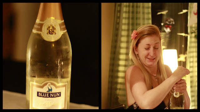 till det dricker vi Blue Nun Sparkling Gold edition (ett mousserande vin fylld med fräsiga flingor av 22 karats guld) finns att beställa genom systembolaget artikelnr 77385.