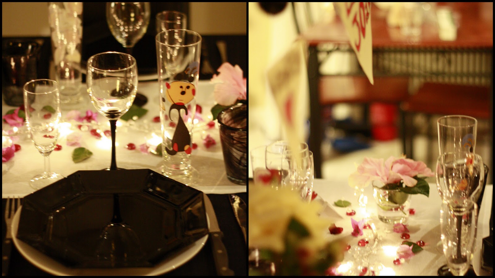 Alla blommor som pryder bordet är egenodlade! Till och med rosorna. Tänk, att jag i november plockat in färska rosor från trådgården!!!! De lila blommorna är borgonvillea sånna ni vet som man ser på sin utlandsemester:) Jag är tokig i exotiska växter och har alla möjliga här hemma. Min hibiskus blommade lagom till den här dagen också, så orolig jag har varit att den inte skulle det!
