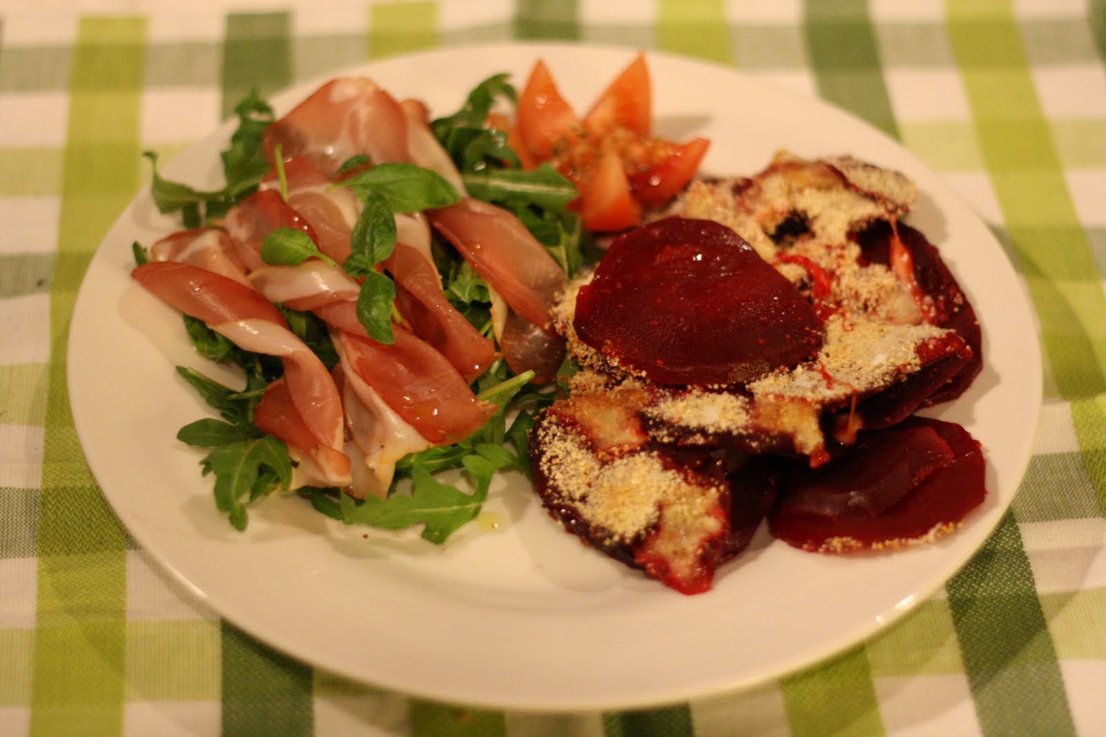 Gör så här. Skala de färska rödbetorna och koka upp i saltat vatten i ca 14 minuter. Skiva rödbetorna när de svalnar och varva en ugnsform med smulad mozarella och skivade rödbetor. Strö över ströbröd på toppen och gratinera dessa i ugnen i 220 grader i ca 15 minuter. Servera rödbetsgratängen tillsammans med kallrökt skinka på en bädd av roccolablad och lägg en halv tomat vid sidan om. Strö över lite färsk basilika över skinkan och droppa några droppar tryffelolja eller olivolja.